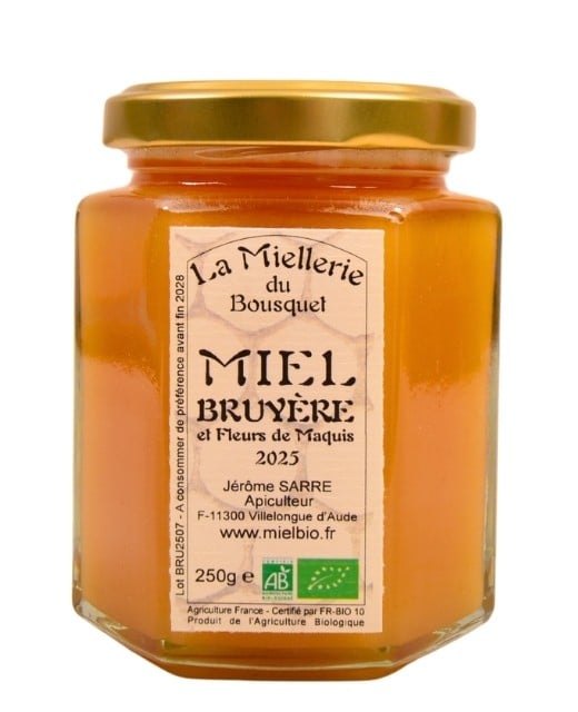 Le miel de bruyère a été récolté en juin dans les maquis des Corbières dans le Sud de la France. De couleur ambrée claire, il a un arôme très généreux et persistant, avec des notes boisées, caramélisées et beurrées.