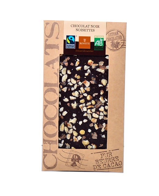 Cacao 73%, chocolat origine St Domingue à 73% de cacao minimum* (masse de cacao*, sucre de canne*, beurre de cacao*, vanille*), noisette 8%*. *produits issus de l'agriculture biologique. Peut contenir des traces de fruits à coque, de produits laitiers et de lécithine de soja.
