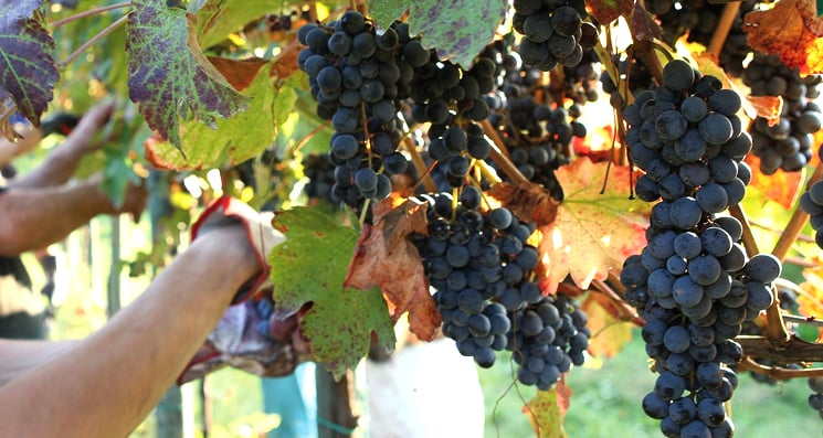 Coupées au sécateur, les grappes sont entreposés dans le sceaux des cueilleurs pour être ensuite transférées dans une remorque qui circule entre les rangées de ceps.