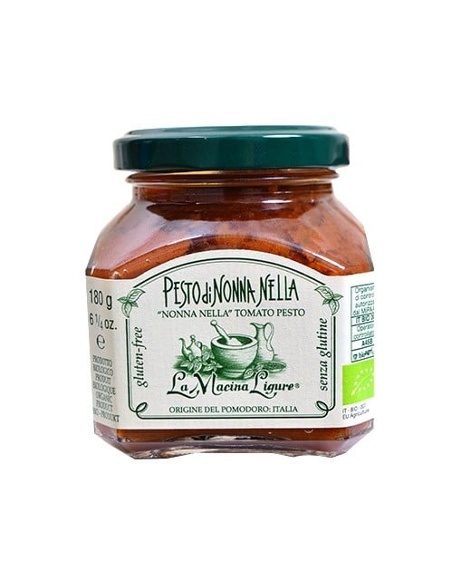 Dans cette recette, le pesto Nonna Nella est beaucoup moins salé qu'un pesto rosso traditionnel. Cela s'explique par le fait que la sauce tomate remplace les tomates séchées. L'ensemble en fait une sauce plus douce et très parfumée.